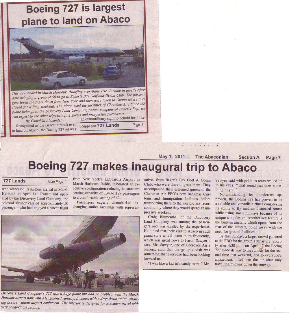 A clip from the May 2011 Abaconian shows a press release of the Discovery Land Company's 727 flying to Abaco from New York, carrying rich guests in hopes of wooing them into buying land at Bakers Bay.