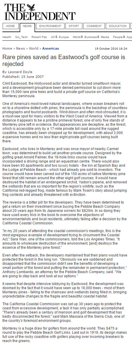 The Independent writes, "In my 20 years of attending the coastal commission's meetings, this is the most egregious example of development trying to circumvent the Coastal Act," Sara Wan, one of the commissioners, told the Los Angeles Times. "It amounts to wholesale destruction of the environment, [and] destroys the essence of the Monterey pine forest."