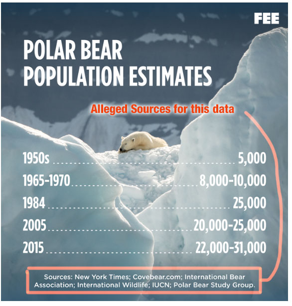 The original number of 5,000 polar bears in the 1950s was a non-scientific conjecture made, apparently, by a Soviet Arctic Expedition that was quoted in a Soviet children’s book. The Foundation for Economic Education is supposed to be a free-market organization, and yet here they are using a conjecture from the defunct communist empire as their primary data source.