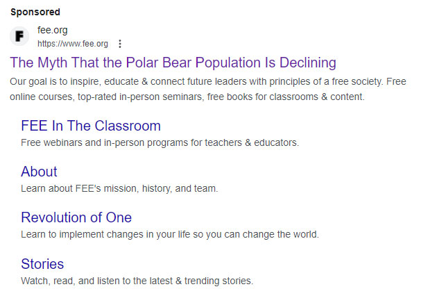 It may seem counterproductive to debunk an article from 5 years ago, however, the Foundation for Economic Education is actively targeting pay-per-click search queries—including those typical of middle-school students—about polar bear population numbers, directing people in the year 2024 to what is by all accounts climate misinformation. Google’s policies on climate change denial advertisements are clearly not being followed. It is up to global citizens to report misinformation from the Foundation for Economic Educationto any platform where they pay to misinform.
